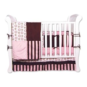 Overstock Bedding, Bubblegum is a modern color combination perfect for today's nursery of pink with chocolate and caramel in motifs of open circles and dots with tonal awning stripes. Texture is added with super soft velour and ultra-suede accents. Simply perfect. Set includes: 4 separate bumpers to fit any crib, patched quilt, pink 100% cotton jersey sheet with deluxe 10" pocket, 15" long box pleat skirt.